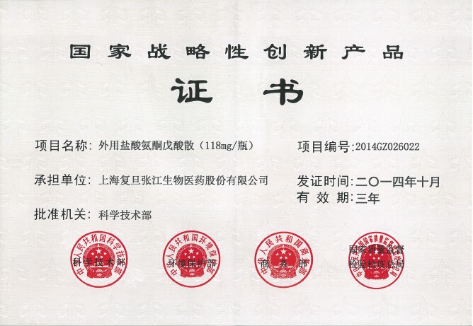 The company's photodynamic therapy drug "Aminolevulinic Acid Hydrochloride" (118mg/vial) (ALA®) project has been successfully selected the "National New Products Program" and awarded as the "National Strategic Innovative Product". The "National New Products Program" in 2014 focused on cultivating and developing strategic emerging industries, saving energy and reducing emissions, and continuing to increase support for the new high-tech products with independent intellectual property rights.