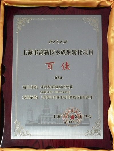 2012年7月,本公司的产品外用盐酸氨酮戊酸散(艾拉®)获得“2011年度上海市高新技术成果转化项目百佳”称号,名列第24位,医疗产品类第3位,药品类第1位。 艾拉®入选百佳,是对其突出的经济效益和社会效益的充分肯定,同时也是对本公司在推动企业创新、科技成果加速转化及高新技术产业发展方面所取得的成绩的充分肯定。这必将激励公司全体同仁积极拼搏,锐意创新!