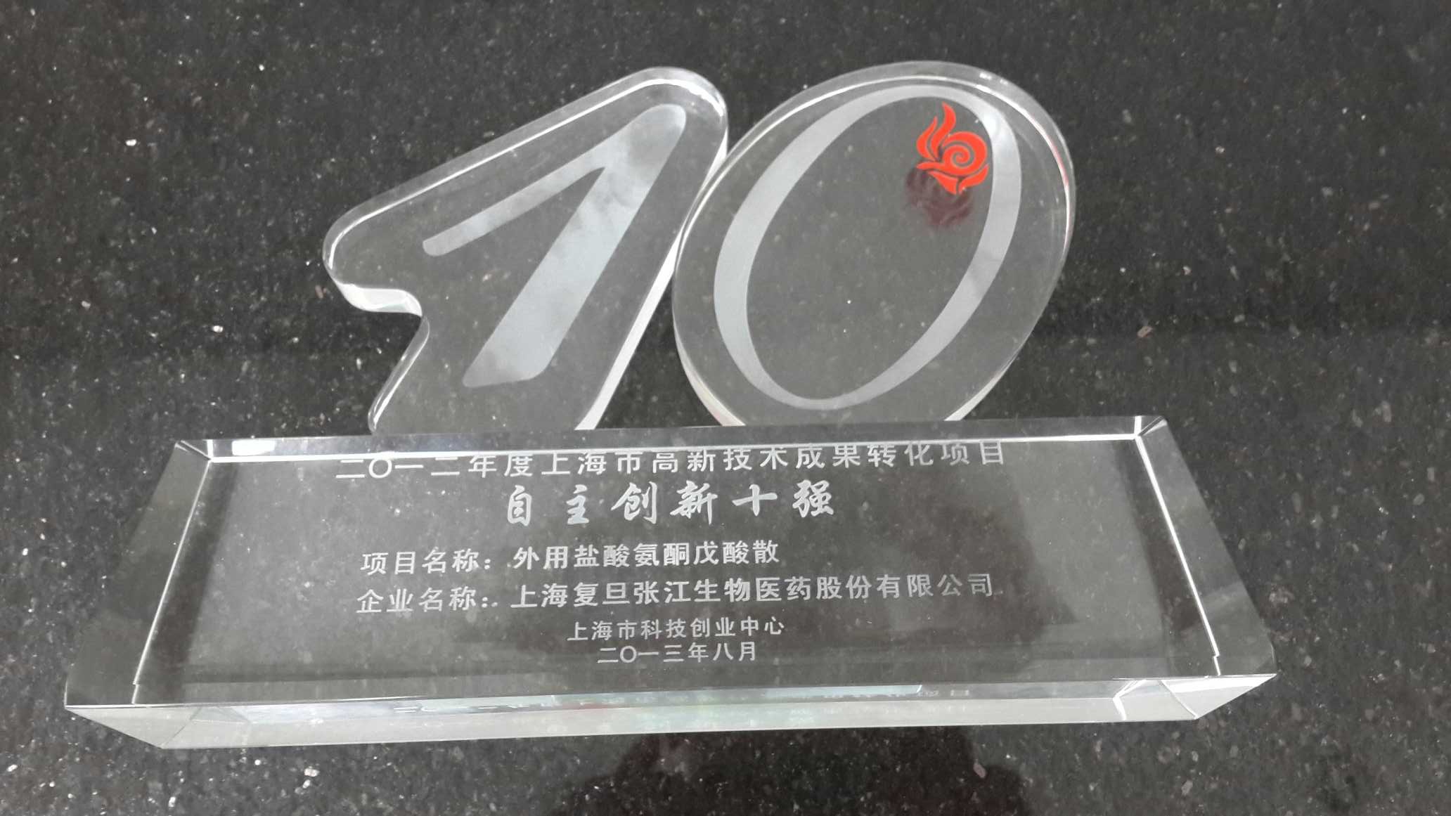 2013年8月,复旦张江自主创新产品--外用盐酸氨酮戊酸散(艾拉®),同时被评为"2012年度上海市高新技术成果转化项目自主创新十强"和 "2012年度上海市高新技术成果转化项目百佳"的称号,并且名列第一位。这是继2012年7月,获得"2011年度上海市高新技术成果转化项目百佳"称号后的又一次殊荣。